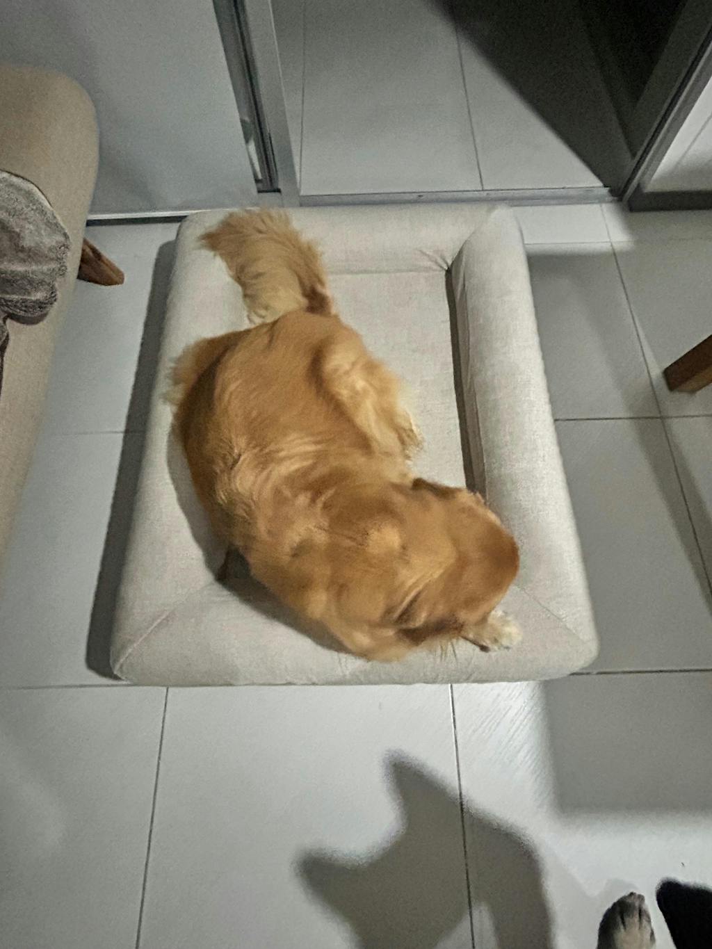 Es totalmente normal. Ha sido sellada al vacío para su envío. Permite hasta 7 días para que se infle completamente y la tela beige recupere su estado natural. Tu perro puede usarla de inmediato.