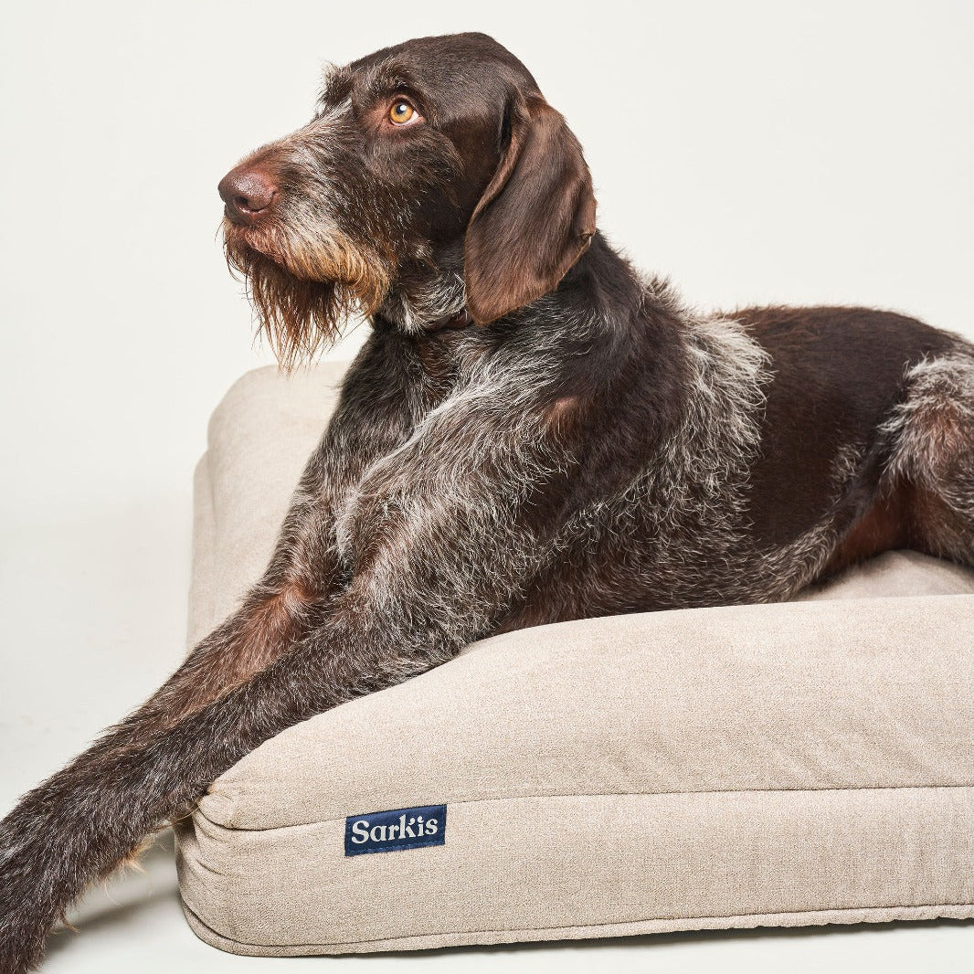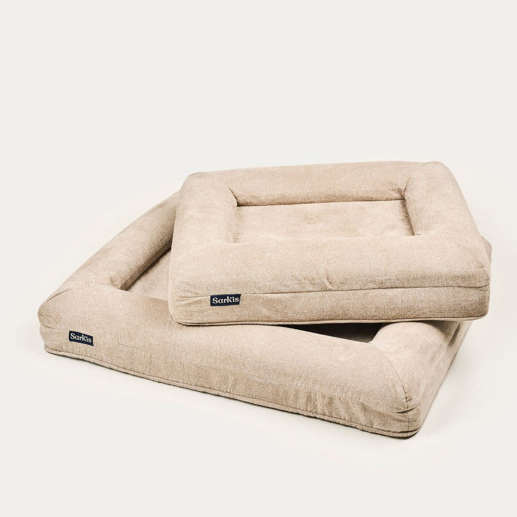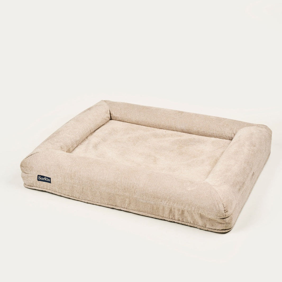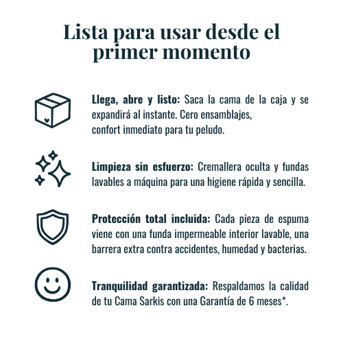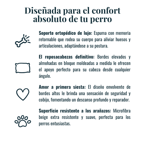 La Cama Sarkis Premium es el espacio de descanso definitivo para tu perro: combina un soporte ortopédico real, materiales premium y un diseño elegante que se integra en cualquier hogar. Su espuma con memoria de tecnología High Soft brinda alivio total para articulaciones, mientras que sus reposacabezas integrados moldeados en bloque ofrecen el apoyo perfecto para que tu perro descanse el hocico y mantenga una postura cómoda y alineada.